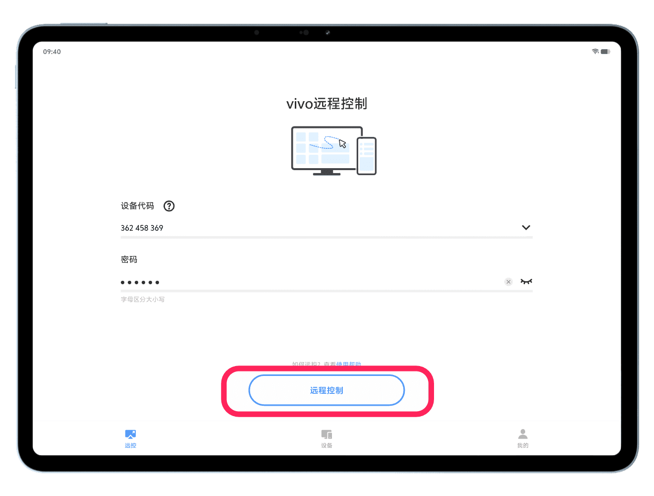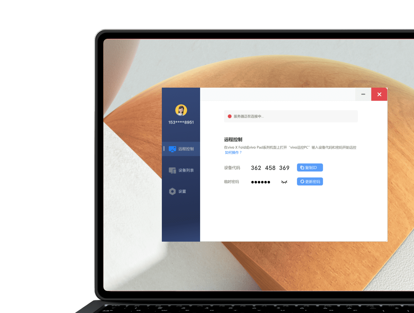 在 vivo远控PC 应用中,查看电脑的设备代码和密码。