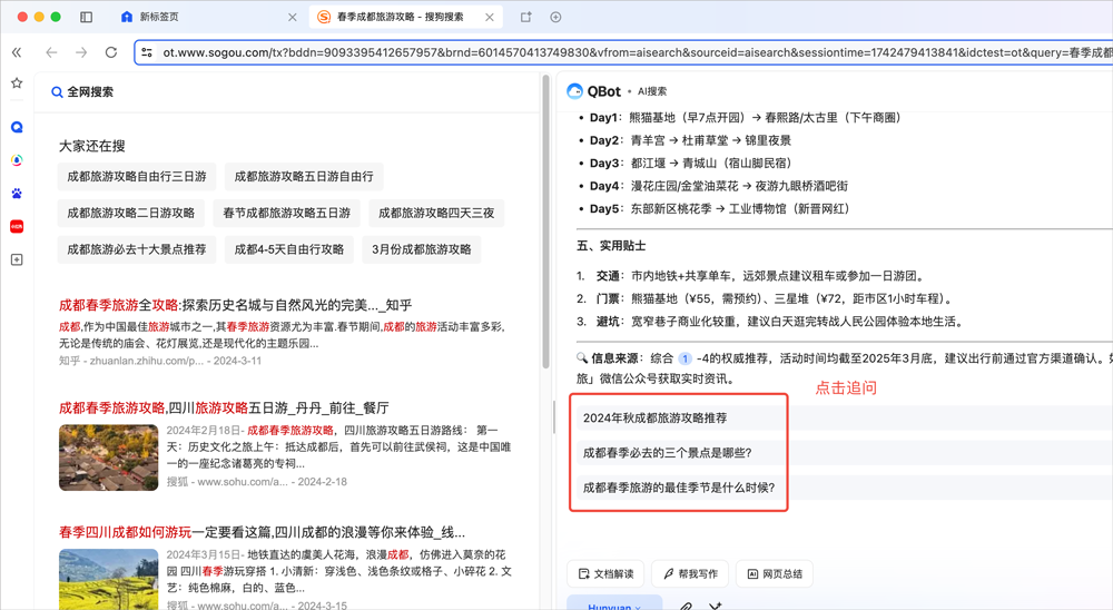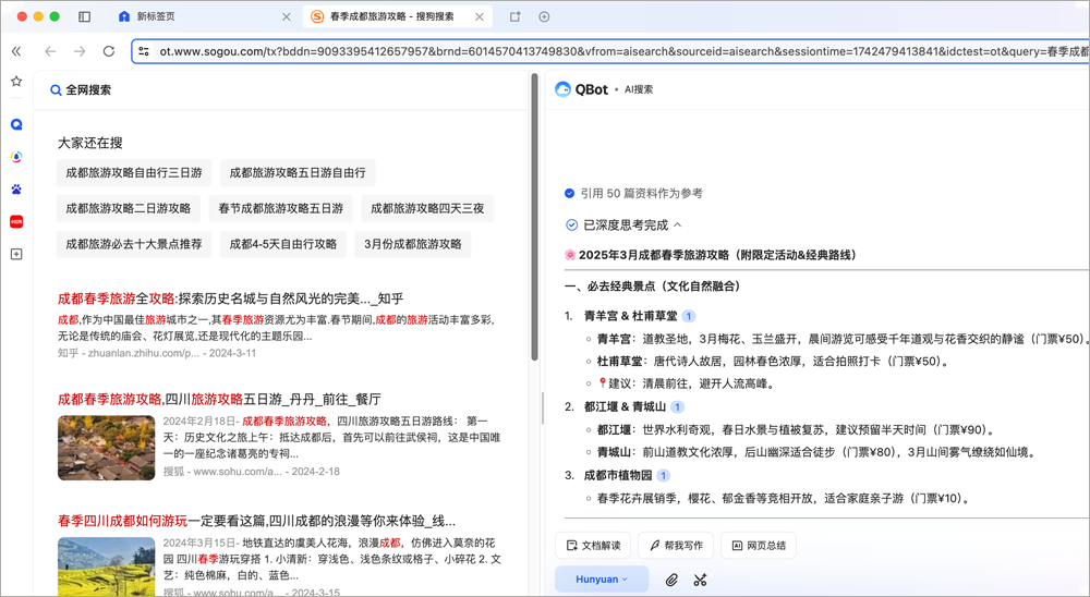 右侧为AI搜索结果,可进一步查看引用文章、深度思考过程。·左侧为传统搜索结果,便于访问优质原文