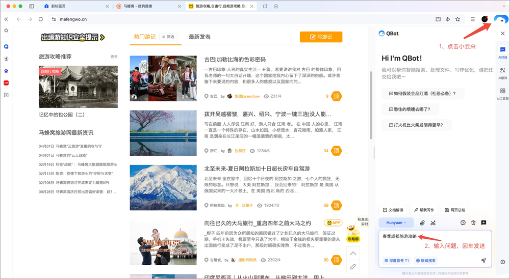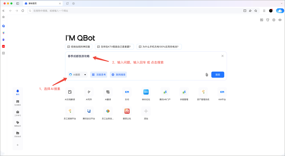 (1)首页入口:打开QQ浏览器首页,选择“AI搜索”,输入问题后点击搜索