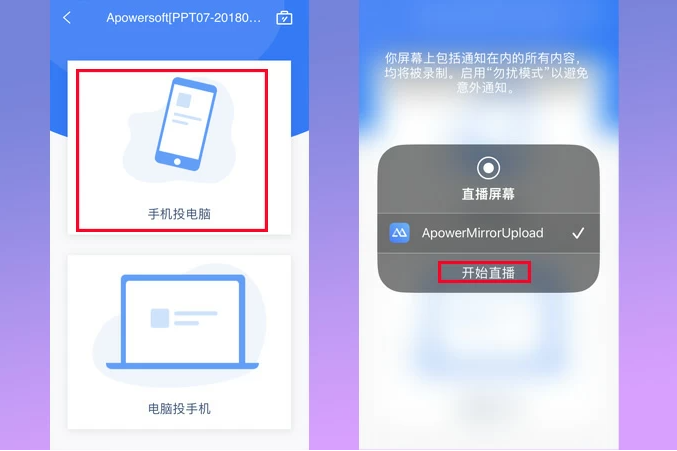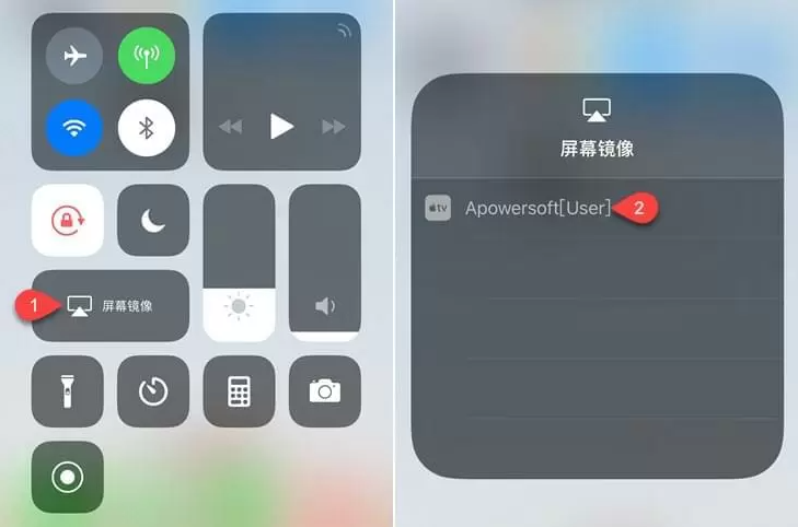 2、上滑/下滑打开控制中心,点击【屏幕镜像】,选择开头为Apowersoft的您的电脑设备,就可以看到苹果手机被投在电脑上了。