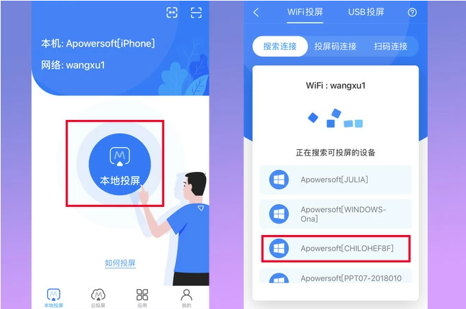 3、下拉搜索可供投屏的设备,选择开头为Apowersoft的您的电脑设备,