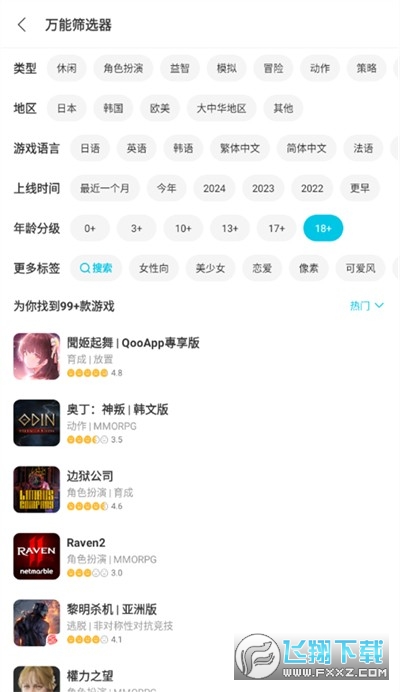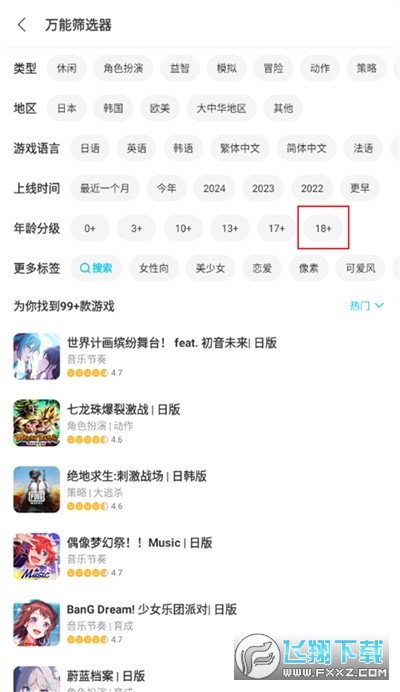 4、点击后即可将18+分级的游戏全部筛选出来,玩家还可以选择其他的筛选分类更加精准的去筛选。