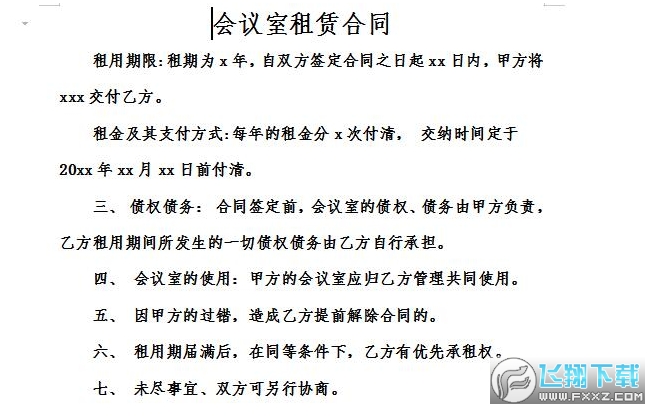 会议室租赁合同是指出租方与承租方就会议室租赁所达成的书面合同,围绕着会议室租使用权所形成民事租赁关系。会议室租赁合同免费版,由飞翔下载为您提供免费下载,源文件为docx格式,方便用户自行编辑。更多关于会议室租赁合同免费下载请关注飞翔下载。
